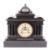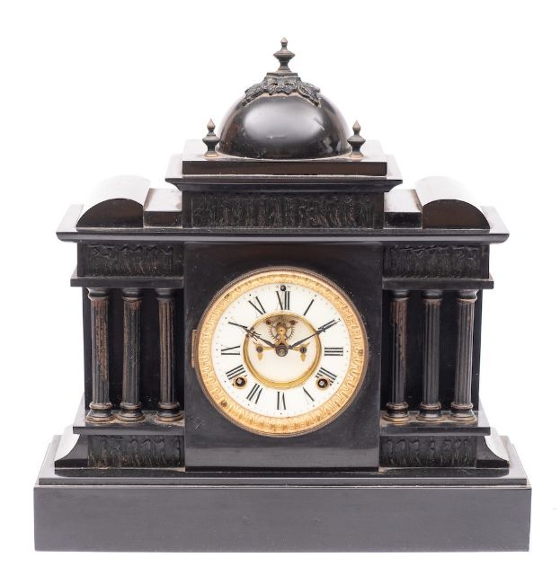 An American black slate mantel clock: the eight-day duration movement striking the hours on a gong, the cream enamel dial with visible escapement set to the centre, black Roman numerals and blued steel hands, the black slate case of classical design with fluted columns and dome-topped architectural pediment, height 42cm.