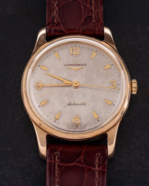 A Longines 'Automatic', wristwatch,: silvered dial with Arabic numerals and triangular markers, diameter of dial ca. 28mm, case hallmarked for 9ct gold and stamped inside DS&S, the movement stamped for Longines and numbered 9145600, accompanied by fitted case and guarantee.