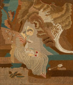 A Regency period woolwork picture: depicting a seated young woman comforting a wounded animal, an arrow lying at her feet, framed and glazed, 49.5 x 43cm.