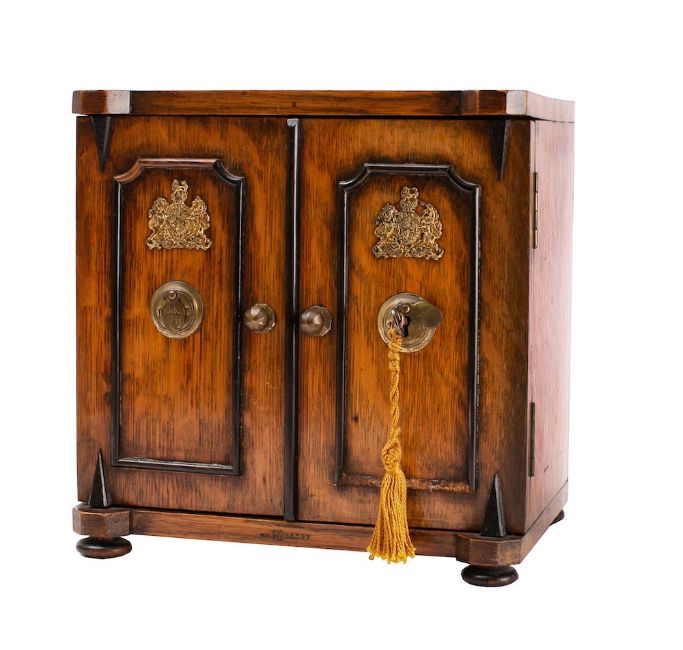 An Edwardian oak humidor in the form of a safe: with rectangular top and a pair of moulded panelled doors enclosing four short drawers, raised on squat bun feet, 25cm wide.