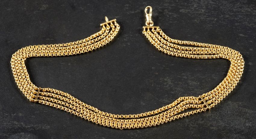 A four row, belcher-link chain with two bar spacers and a dog clip,: length ca. 39cm, total weight ca. 13.5gms.