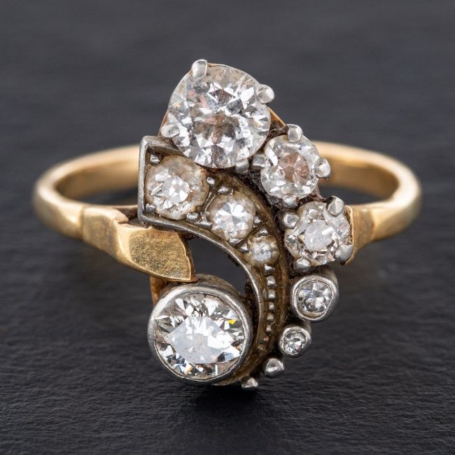 An old and single-cut diamond ring,: estimated weight of old-cut diamonds ca. 1.30cts, I-K colour, SI2-P1 clarity, estimated weight of remaining diamonds ca. 0.05cts, stamped '18ct', ring size Q, length of ring head ca. 1.7cm, total weight ca. 4.9gms.