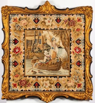 A 19th century gilt framed woolwork tapestry: depicting a women and a young boy in a rowing boat, enclosed by a Berlin work style floral border, mounted in a gilt frame, 57 x 55cm.