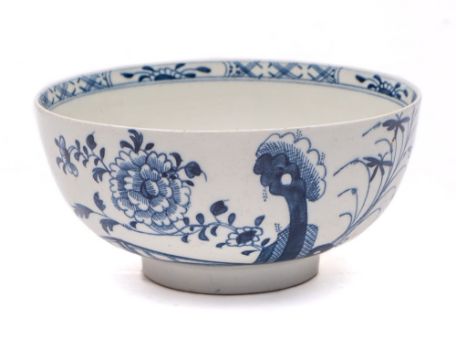 A Lowestoft blue and white slop bowl: painted in the 'Peony Fence Rock' pattern, circa 1770-80, 15cm [minor firing fault].