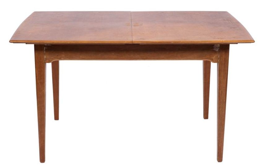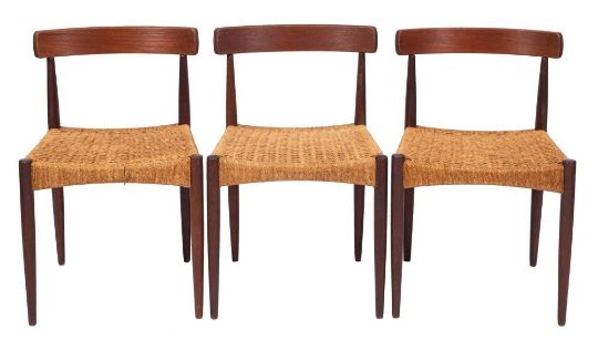 Arne Hovmand-Olsen [1919-1989] for Mogen Kold,: a suite of six teak dining chairs, each with curved toprail over paper cord woven seats, raised on tapered leg supports, metal Danish Furniture Makers Control marks and manufacture's label to sub-frame, together with an associated mahogany dining table with central fold over leaf, raised in square tapering legs, 86 x 168cm extended.