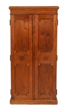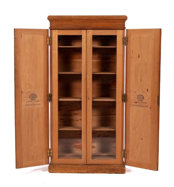 A hardwood shop cigar cabinet, early 20th century,: the moulded cornice above twin panel doors, each stamped H.UPMANN HABANA, the door interiors further stamped and inscribed 'Specially imported for W.Ariel Gray & Co. Ltd.; with subsidiary interior glass doors opening to shelves; 159cm high, 80cm wide, 30cm deep