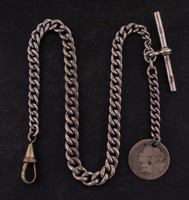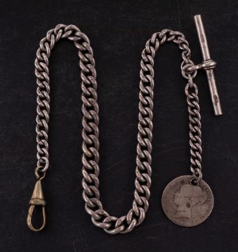 A silver Albert pocket watch chain: curb link marked for silver, with silver bar, overall length 28cm.