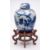A Chinese porcelain oviform jar and cover: painted in blue with birds amongst peony and pierced rocks, concentric circle marks to base, 34cm high, together with a wooden stand. [damages]