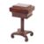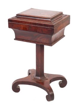 A George IV mahogany teapoy, circa 1825,: the sarcophagus top with cavetto moulded and cockbeaded sides, the hinged cover opening to a fitted interior with four subsidiary caddies and two (possibly associated) glass vessels; on a hexagonal shaft to a quatreform base on in-scrolled legs, on castors; 79cm high, 45cm wide, 37cm deep