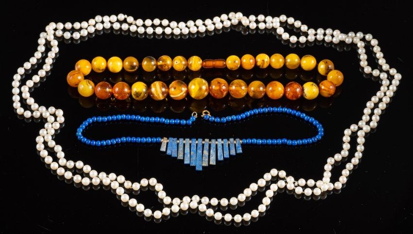 A lapis lazuli bead necklace,: the central fringe of polished lapis lazuli batons with spacers in between, to lapis lazuli bead necklace, 40.5cm long; together with a cultured pearl necklace and an amber bead necklace.