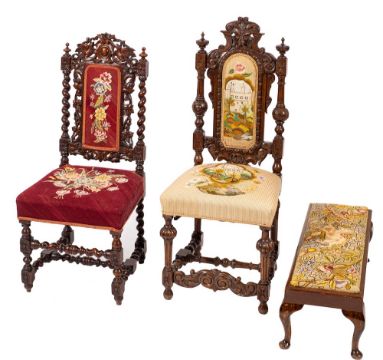 Two Victorian carved oak and tapestry work upholstered side chairs in Jacobean style, late 19th century,: the backrests with carved motifs around fabric panels, the seats with depictions of a floral arrangement and a castle in a reserve respectively; 118 and 108cm high; and a tapestry work upholstered hearth stool, early 20th century