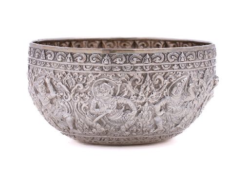 An Indian silver bowl: of circular outline, with embossed decoration of deities, 13cm diameter, 205gms, 6.60ozs