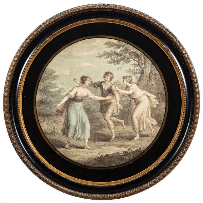 After Angelica Kauffman [19/20th Century]-Blind Man's Buff; Beauty,:-a pair, mezzotintstondo, each 27cm,in verre eglomise frames. [2]
