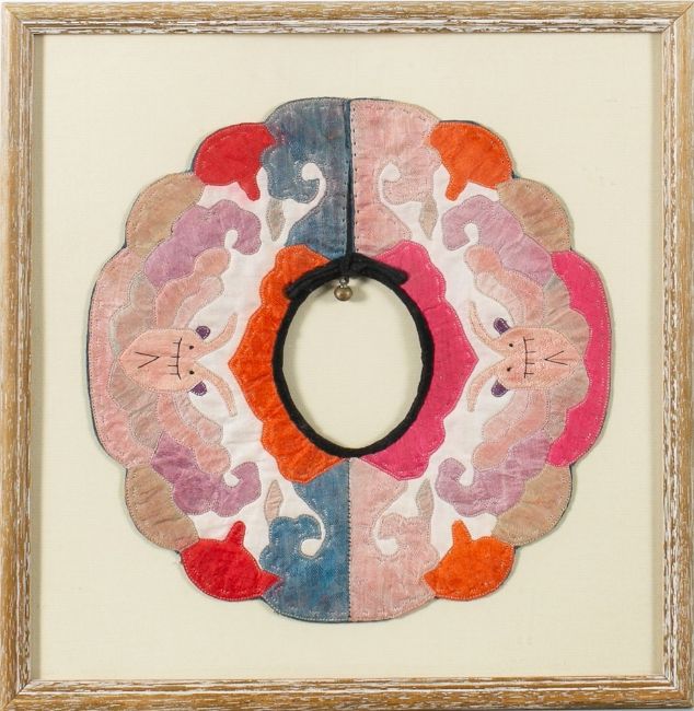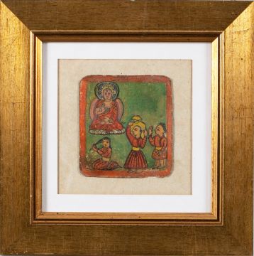 A South-East Asian thanka: with central panel depicting a seated Buddha, enclosed by animals and other seated Buddhas, 46 x 36cm, a Chinese watercolour on silk of a pair of Pekingese dogs, 26 x 26cm, a Chinese silk embroidered collar framed and glazed, together with five other pictures (8).