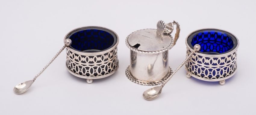 A pair of Victorian silver salts, maker George Unite, Birmingham, 1849: of circular outline with pierced trellis decoration, raised on ball feet, with blue glass liners, 5cm diameter, a non matching silver mustard pot and cover, together with two salt spoons, weighable silver 117gms, 3.77ozs.
