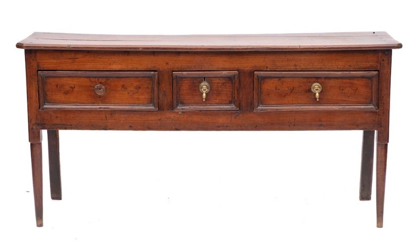 A George I fruitwood dresser, early 18th century,: the rectangular top with canted front corners and moulded front and side edges; the front with three panel drawers; on turned front legs and stile back legs; 77cm high, 154cm wide, 45cm deep