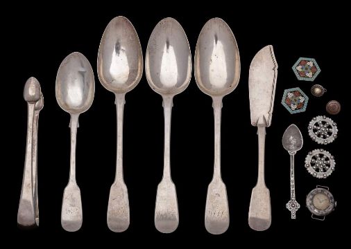 A mixed lot of silver wares and collectables, various makers and dates: includes three Fiddle pattern tablespoons, Fiddle pattern dessert spoon, all initialled, a sugar tongs and coffee spoon, silver cased wristwatch a Fiddle pattern butter knife and assorted buttons, weighable silver 349gms, 11.22ozs