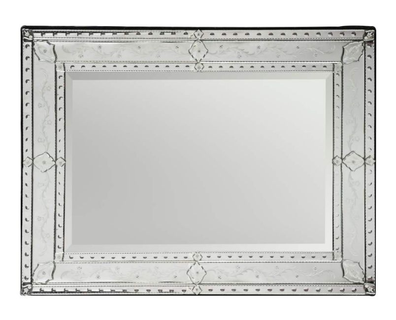 An etched glass rectangular wall mirror, second half 20th century,: the bevelled plate within concentric margins of repeating circlets and trailing foliage; on an ebonised wood backboard; 123 x 91cm