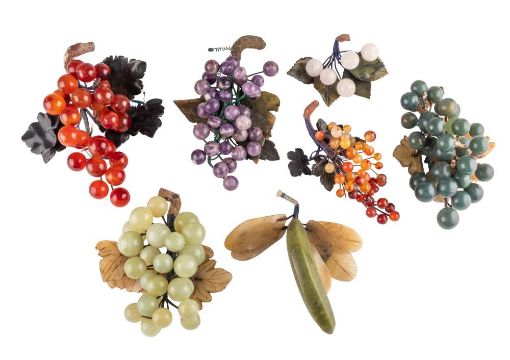 A collection of late 19th century polished hardstone fruits: including bunches of grapes, banana, etc.