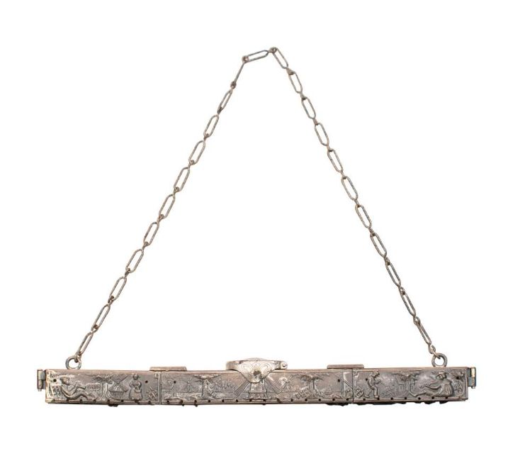 A Dutch white metal purse frame: of slim rectangular form decorated with figures and windmills, 20.5cm wide.