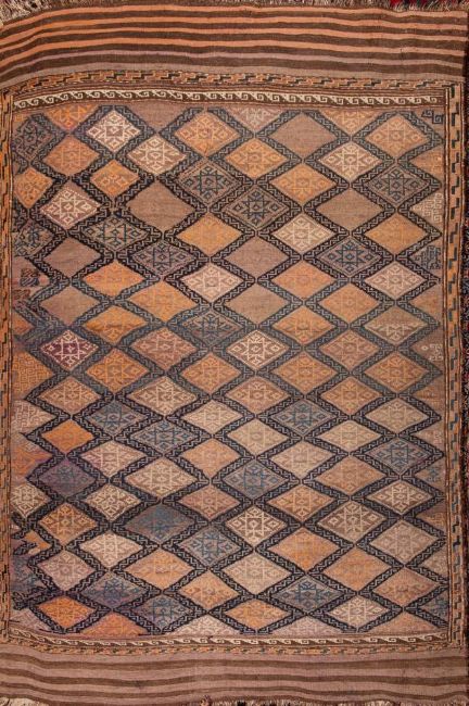 A Turkoman flatweave:, the lozenge stellar panelled field enclosed by a narrow hooked border and end stripes, 235cm x 160cm.
