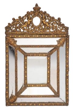 A Dutch repousse brass framed marginal wall mirror, in 17th century style, late 19th century,: the cresting with urn finial above wreath bearing amorini amongst dense scrolling foliage; the central rectangular bevelled plate with two concentric borders of further mirrored plates; 86cm high, 54cm wide