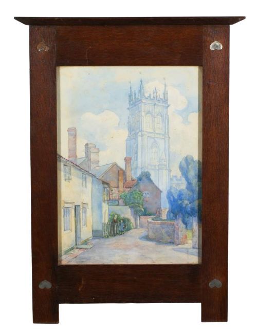 English School Circa 1907-View to a cathedral,:-signed with a monogram and dated '07watercolour, 38 x 27, in an Arts & Crafts oak frame with heart motifs to corners [one missing].