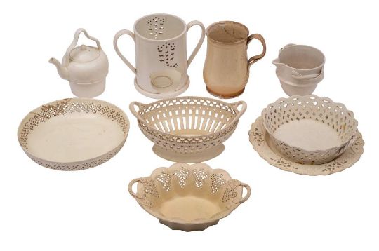 A mixed lot of late 18th/19th century plain creamware: including three baskets, a pierced edge plate and similar bowl, a baluster mug, a pt. vielleuse etc [a lot] some faults.