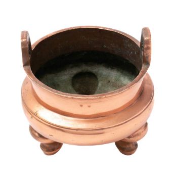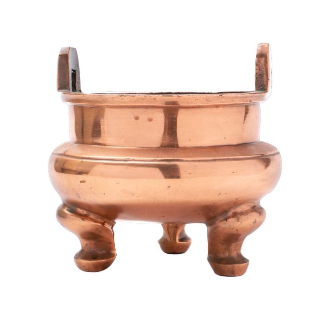 A Chinese copper censer: of circular form, with pierced lug handles to the rim, raised on three curved legs, 21cm diameter.