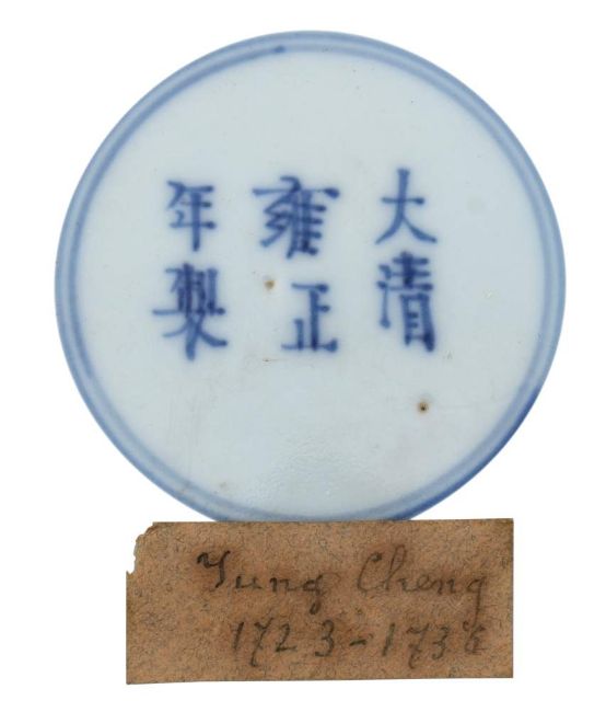 A Chinese famille rose saucer dish: painted in 'boneless' style with two magpies, a blossoming prunus branch, peony, lingzi and rockwork, six-character Yongzheng mark within a double circle and of the period, 20cm [glaze flaw].