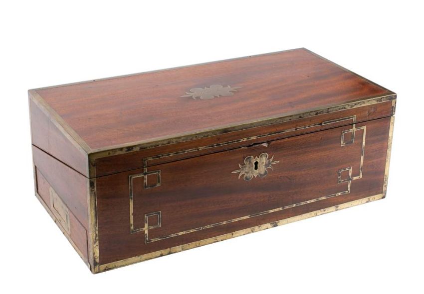 A 19th Century mahogany and brass bound writing slope and reading stand: of rectangular outline, the hinged top with brass cartouche signed Captain Morle, enclosing a baize lined writing surface and fitted compartments, with single drawer to the side, 51cm wide.