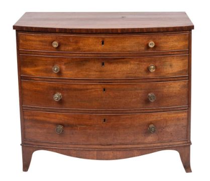 A George III mahogany bowfront chest of drawers, early 19th century,: the four graduated drawers all with twin metal knob handles and cockbeaded edges; above bracket feet; 79cm high, 91cm wide, 57cm deep