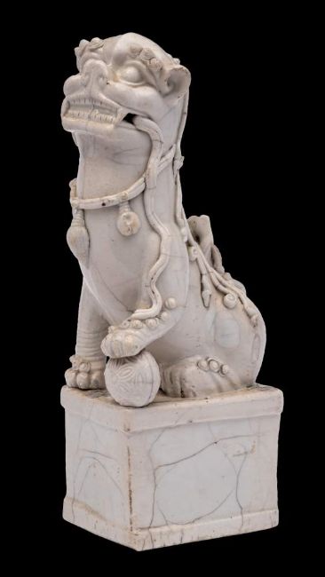 A Chinese blanc-de-chine Buddhist lion dog: on raised rectangular plinth, one paw resting on a brocade ball, a ribbon held in it's jaws, early Qing dynasty, 34cm [some damage and losses including joss stick holder].