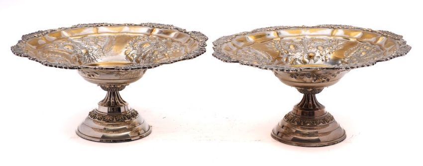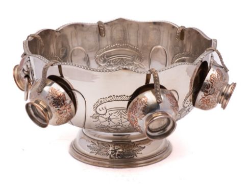 A 20th century silver plated pedestal punch bowl: of circular outline with gadrooned border, incised foliate and scroll decoration, with lion mask ring handles to the sides, on a spreading circular foot, with six matching punch cups, 32.5cm diameter, together with a pair of pedestal fruit comports with foliate and scroll decoration, on waisted stems and weighted domed circular bases, 37cm diameter,