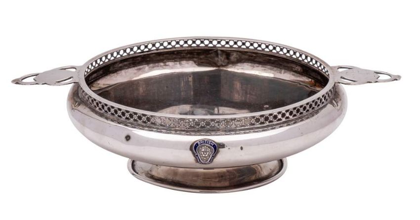 A George V silver fruit bowl, maker Philip Hanson Abbot, Birmingham 1919: inscribed, with galleried rim and pierced lug handles to the sides, raised on a circular foot, 29cm wide, 470gms, 15.12ozs