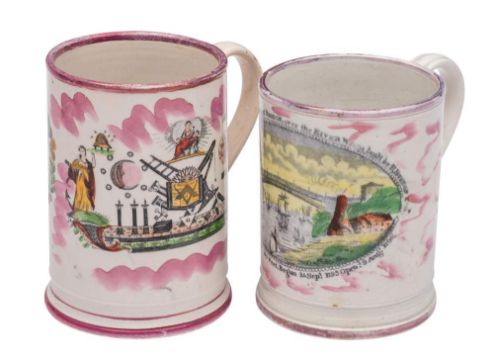 A Sunderland pink lustre 'Masonic' frog mug and 'A West View of the Cast Iron Bridge...' frog mug, both Garrison Pottery: the first with coloured print of the Mason's Arms and verse 'I envy no one's birth or fame...', circa 1840-60, 13cm; the second 12cm [2].