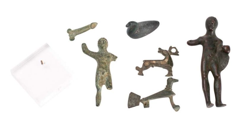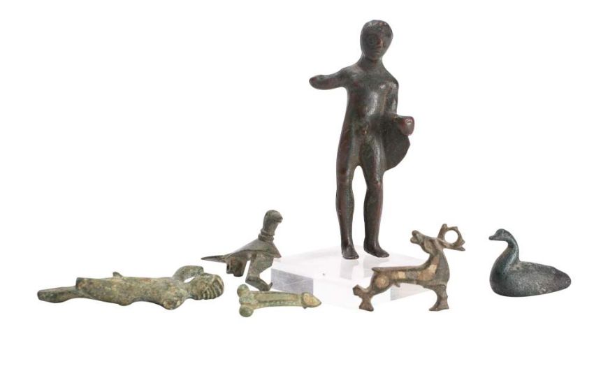 A Roman bronze brooch: in the form of a stag, with traces of enamel, together with a bronze standing figure, another figure and three brooches.