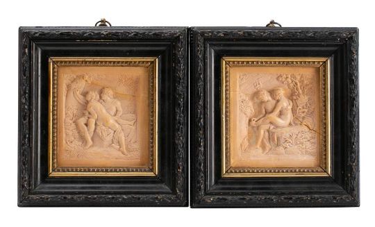 A marble relief oval panel: depicting a Neo-classical warrior, holding a shield standing beside a lion, 31.5 x 25cm. together with two faux marble square panels contained in ebonised frames, the panels 11 x 10cm. (3).
