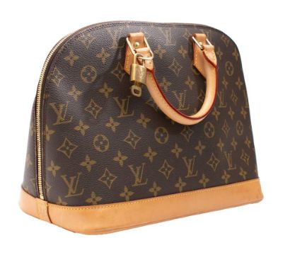 Louis Vuitton. A monogrammed tote bag: tan leather trim, gold tone fittings with single buckle strap, 25 x 28cm.