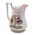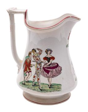 An Elsmore & Forster pottery puzzle jug: of waisted form with angular handle the exterior printed with Commedia dell' Arte figures and Grimaldi the clown, circa 1860, 22.5cm high.