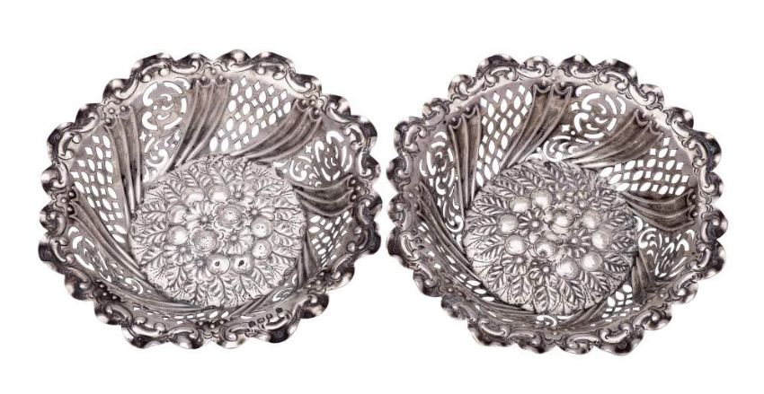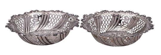 A matched pair of Victorian silver bon bon dishes, maker Horace Woodward & Co, London, 1892/94: of circular outline with embossed floral and pierced trellis decoration, 16cm diameter, 222gms, 7.17ozs