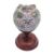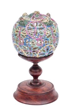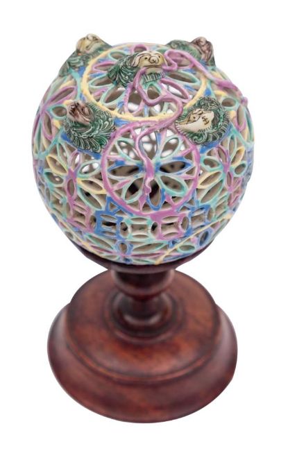 An unusual Chinese famille rose porcelain cricket cage: in the form of a reticulated brocade ball surmounted with five dogs and pink tassels, late Qing Dynasty/20th century, 6cm [in two sections with contemporary? glue repair] and hardwood stand.* Provenance: Martin Grassnick [1917-2020] and thence by family descent.