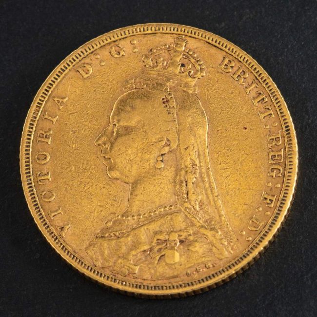 A Victorian gold sovereign coin, 1892,: diameter ca. 22mms, weight ca. 7.9gms.