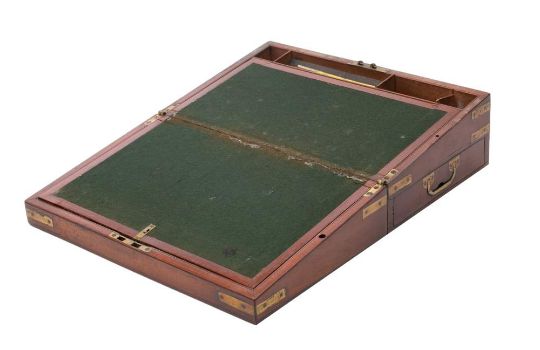 A 19th century mahogany and brass bound campaign writing slope: of rectangular outline, with baize lined writing surface, and single drawer to the side, 40cm wide.