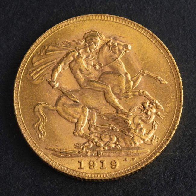 A George V gold sovereign coin, 1919,: diameter ca. 22mms, weight ca. 7.9gms.