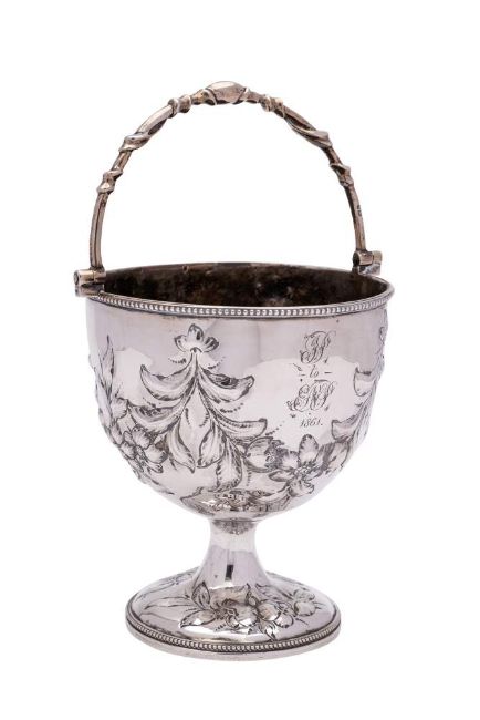 A Victorian silver cream pail, maker Henry Holland, London, 1860: initialled, with loop carrying handle, embossed garland decoration, on a domed spreading circular foot, 20cm high, 229gms, 7.39ozs