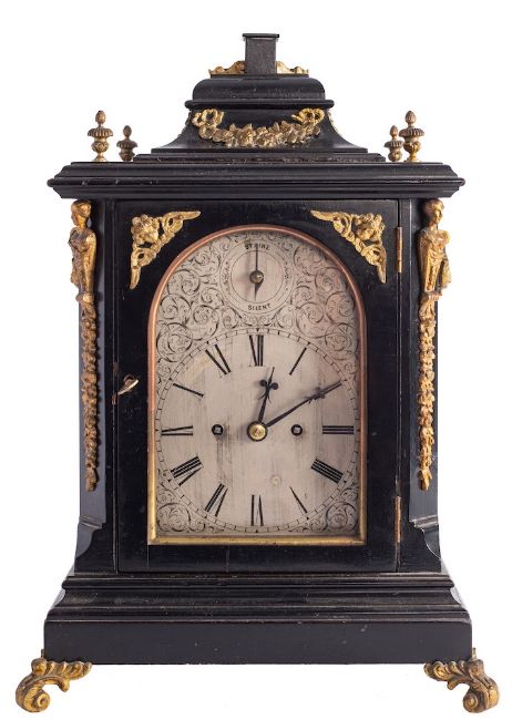 A Victorian ebonised bracket clock: the eight-day duration, double-fusee movement striking the hours on a gong, the five-inch silvered arched dial engraved with scroll decoration, black Roman hour numerals and a 'strike/silent' dial within the arch, with blued-steel hands, the ebonised bell-top case having canted corners with applied carytid mounts, brass fretwork to the sides, applied brass mounts to the front and top, cast brass finials and all standing on matching bracket feet, height 41cm.
