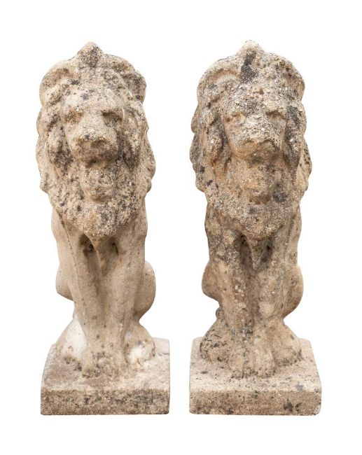 A pair of stone composition pier finials cast as sejant lions, 20th century,: 56cm high