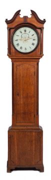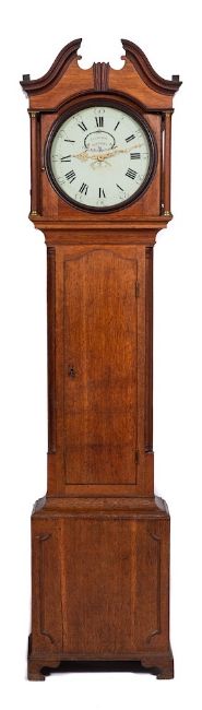 Fletcher, Barnsley, an oak longcase clock: the thirty-hour duration movement striking the hours on a bell, with the thirteen-inch round painted dial having black Roman numerals, date aperture and signed Fletcher, Barnsley, with brass hands, the oak case having quartered columns, the hood with a swan-neck pediment and brass capitals to the pillars, the base with raised mouldings and standing on bracket feet, height 208cm.Biography There are three members of the well-known Fletcher family working in Barnsley, Yorkshire at this period with the maker of this clock quite probably one of the two clockmaking sons of Tobias Fletcher, either Charles born circa 1780 or Tobias II born 1782.Reference Brian Loomes Yorkshire Clockmakers Pub. Daleman Books 1972