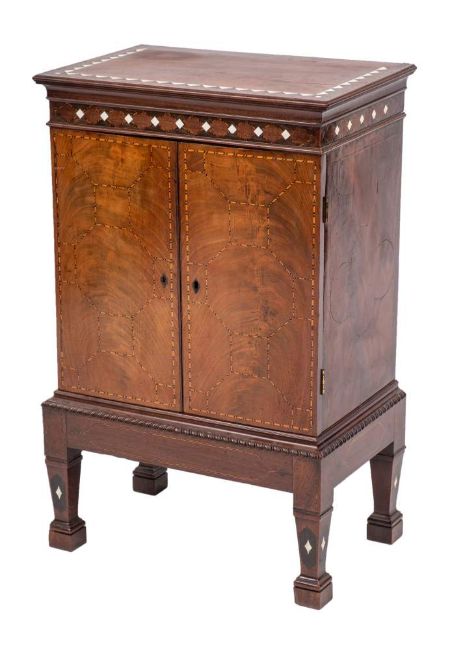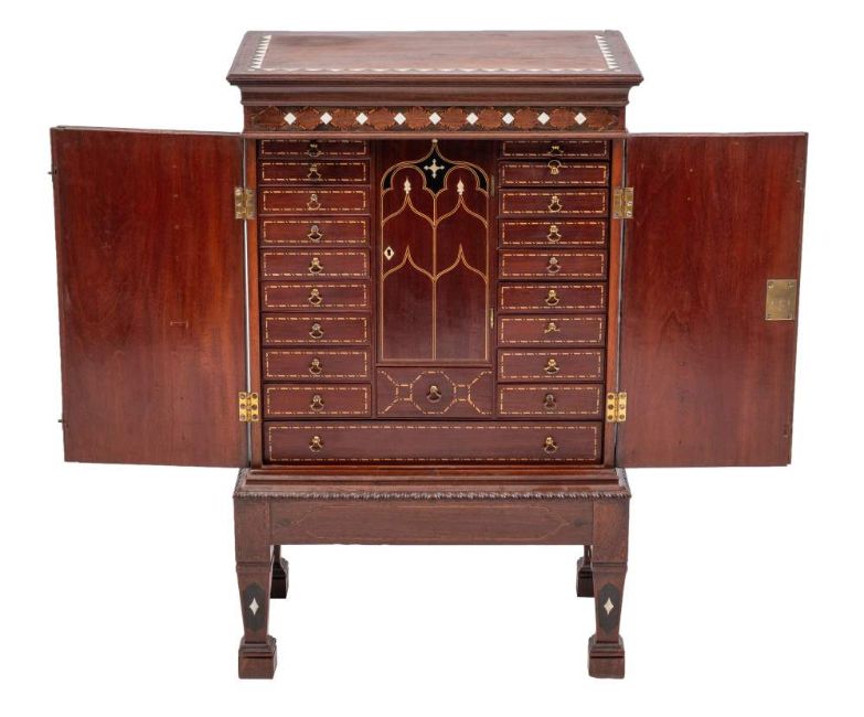 An Italian walnut, ebony, bone and boxwood strung collectors' cabinet, late 19th century,:the top with zig-zag banding within moulded edges; above a frieze of interlinked lozenges; the twin doors with geometric stringing opening to twenty graduated drawers around a door, with Gothic arched inlay; on an integral stand with strung friezes and tapered square section legs and feet; 78cm high, 50cm wide, 32cm deep